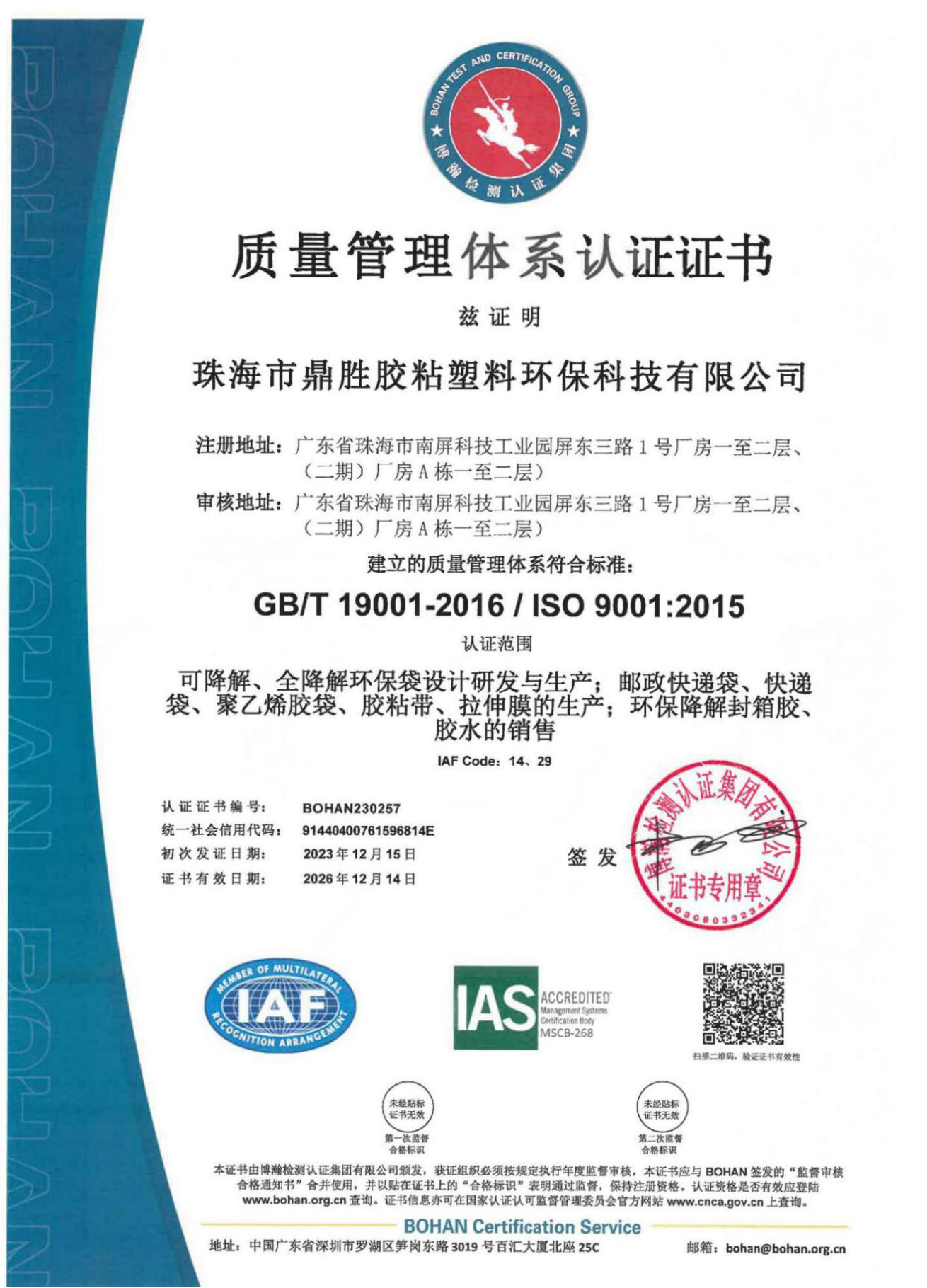 通過質(zhì)量管理體系認(rèn)證證書