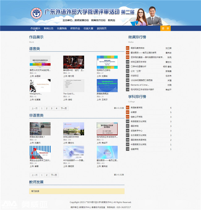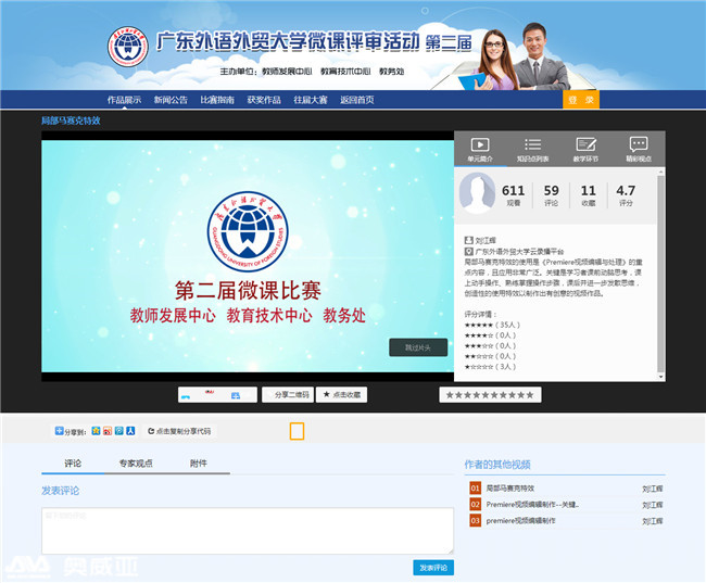 廣外深知微課大賽會(huì)涉及多項(xiàng)繁雜的步驟工作,并找到知名錄播廠家?jiàn)W威亞。針對(duì)廣外的實(shí)際情況,奧威亞在應(yīng)用平臺(tái)上專門設(shè)計(jì)打造了微課比賽活動(dòng)的欄目,將傳統(tǒng)的評(píng)課步驟一一簡(jiǎn)化?,F(xiàn)在,評(píng)課專家可以在線上完成所有的評(píng)課步驟,再也不用看到厚厚的紙質(zhì)評(píng)價(jià)表了~