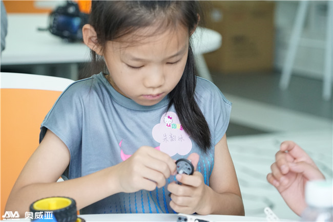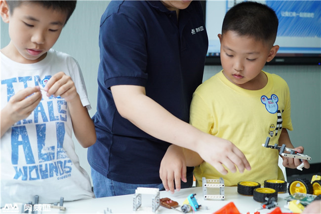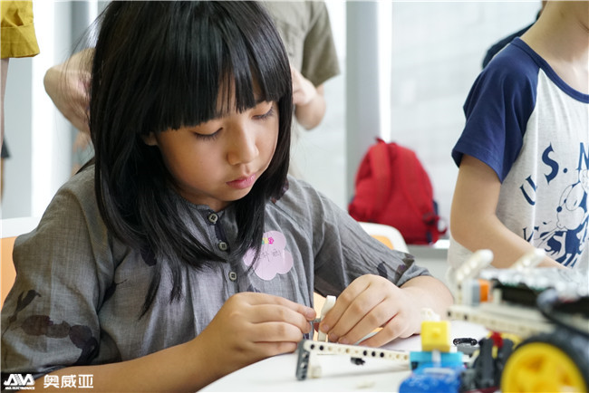 而第二小組,7歲到10歲的孩子則會(huì)交給專(zhuān)業(yè)的輔導(dǎo)老師,挑戰(zhàn)難度更高的戰(zhàn)車(chē)樂(lè)高玩具。第二組的戰(zhàn)車(chē)模型的樂(lè)高玩具是一個(gè)包括塑料積木、電子模塊、手動(dòng)遙控器等幾十種零件的工程積木。孩子可以在家長(zhǎng)、輔導(dǎo)老師的指引下,充分發(fā)揮自身的空間想象能力和動(dòng)手操作能力,將零散的積木變成可移動(dòng)、可遙控的戰(zhàn)車(chē)玩具。