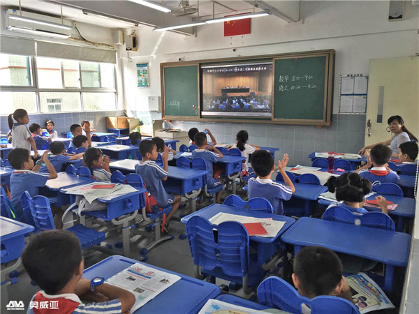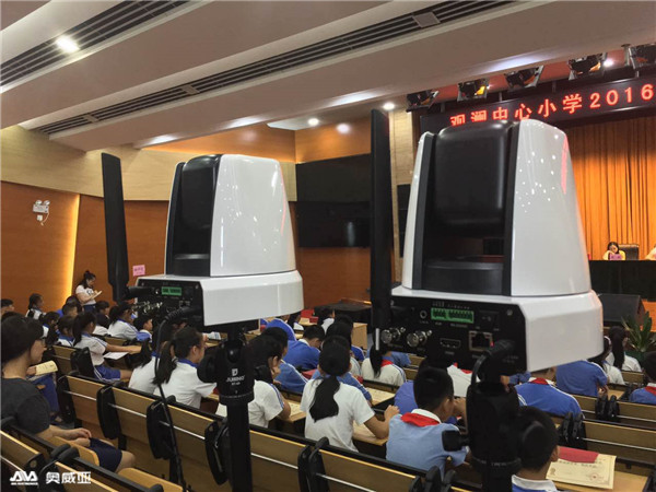 那么,如何讓其他未能到場的學(xué)生也能看到這次表彰大會呢?深圳觀瀾中心小學(xué)在錄播廠家奧威亞的協(xié)助下,利用教育信息化的技術(shù)優(yōu)勢,進(jìn)行了現(xiàn)場直播。通過奧威亞的移動錄播V6和教學(xué)視頻應(yīng)用云平臺,其他老師和學(xué)生在自己的教室就可以看到大會現(xiàn)場的情況。