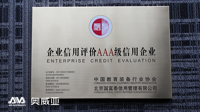企業(yè)信用評價,是指信用評級機構在嚴密分析的基礎上,根據(jù)行政法規(guī)、企業(yè)經(jīng)營情況、財務能力等因素進行綜合考核,對企業(yè)信用程度進行劃等級。信用等級普遍采用國際通行的"四等十級制",具體分為:AAA,AA,A,BBB,BB,B,CCC,CC,C,D。奧威亞經(jīng)過層層考核、評估,最終以良好的經(jīng)營狀況和信譽度,榮獲教育裝備行業(yè)AAA級的企業(yè)信用證書。